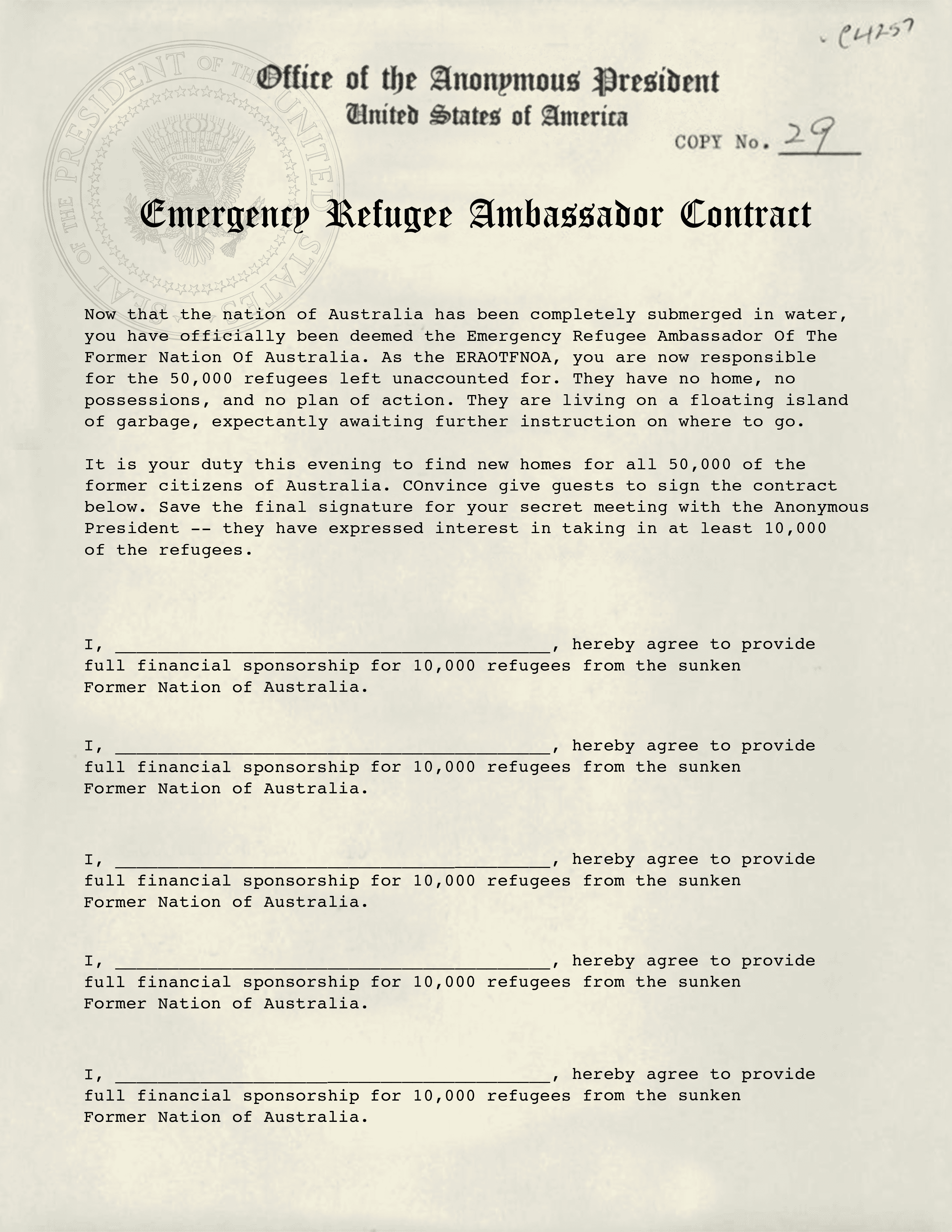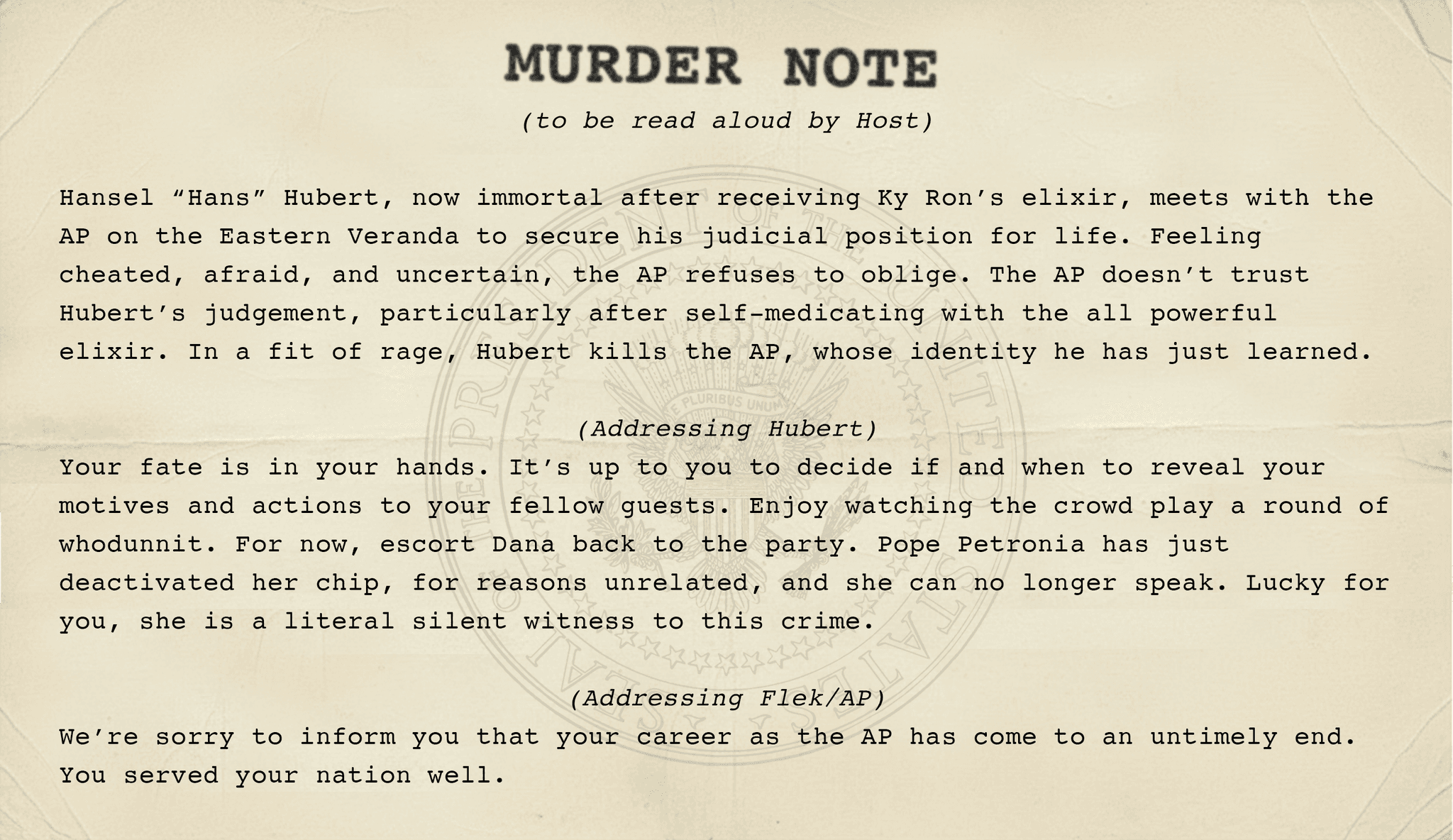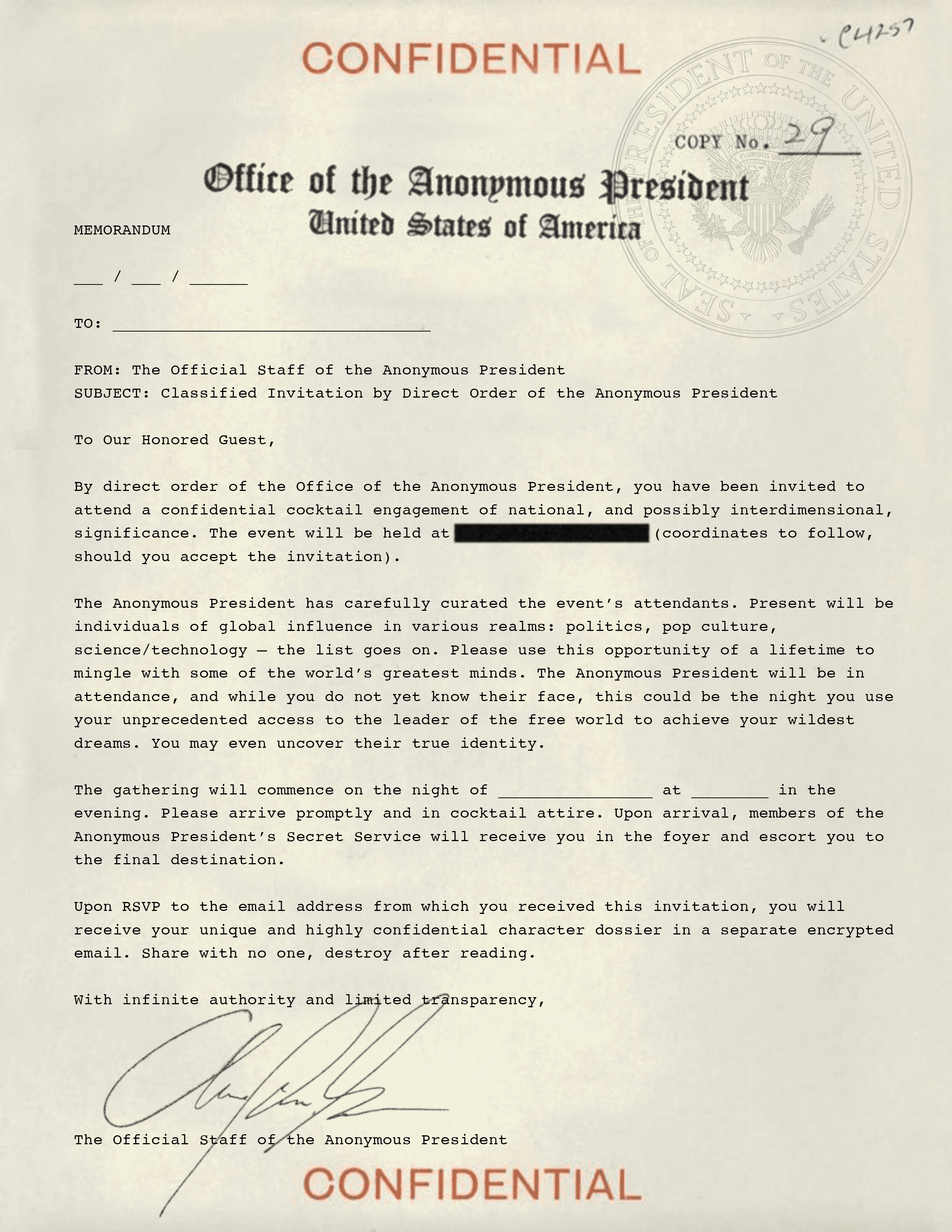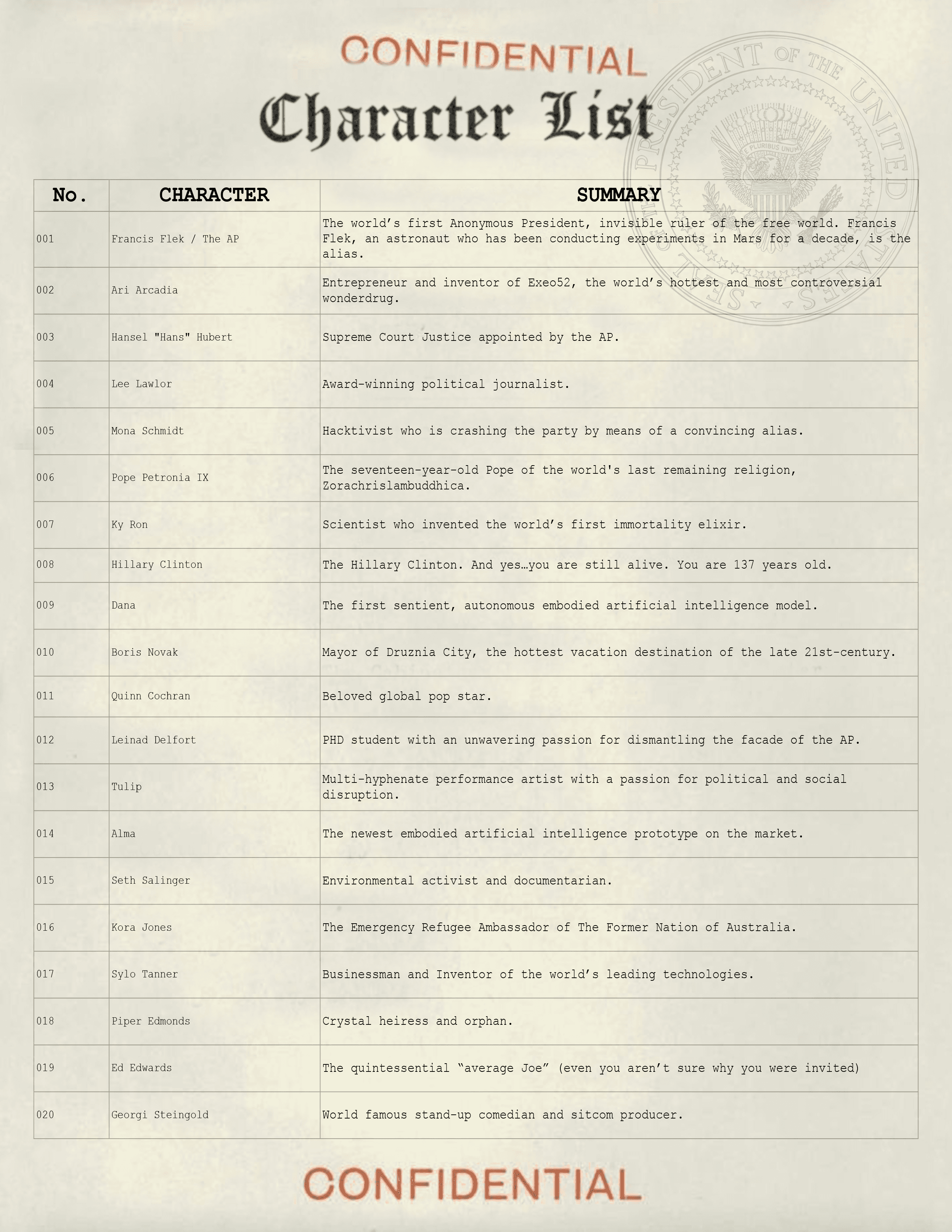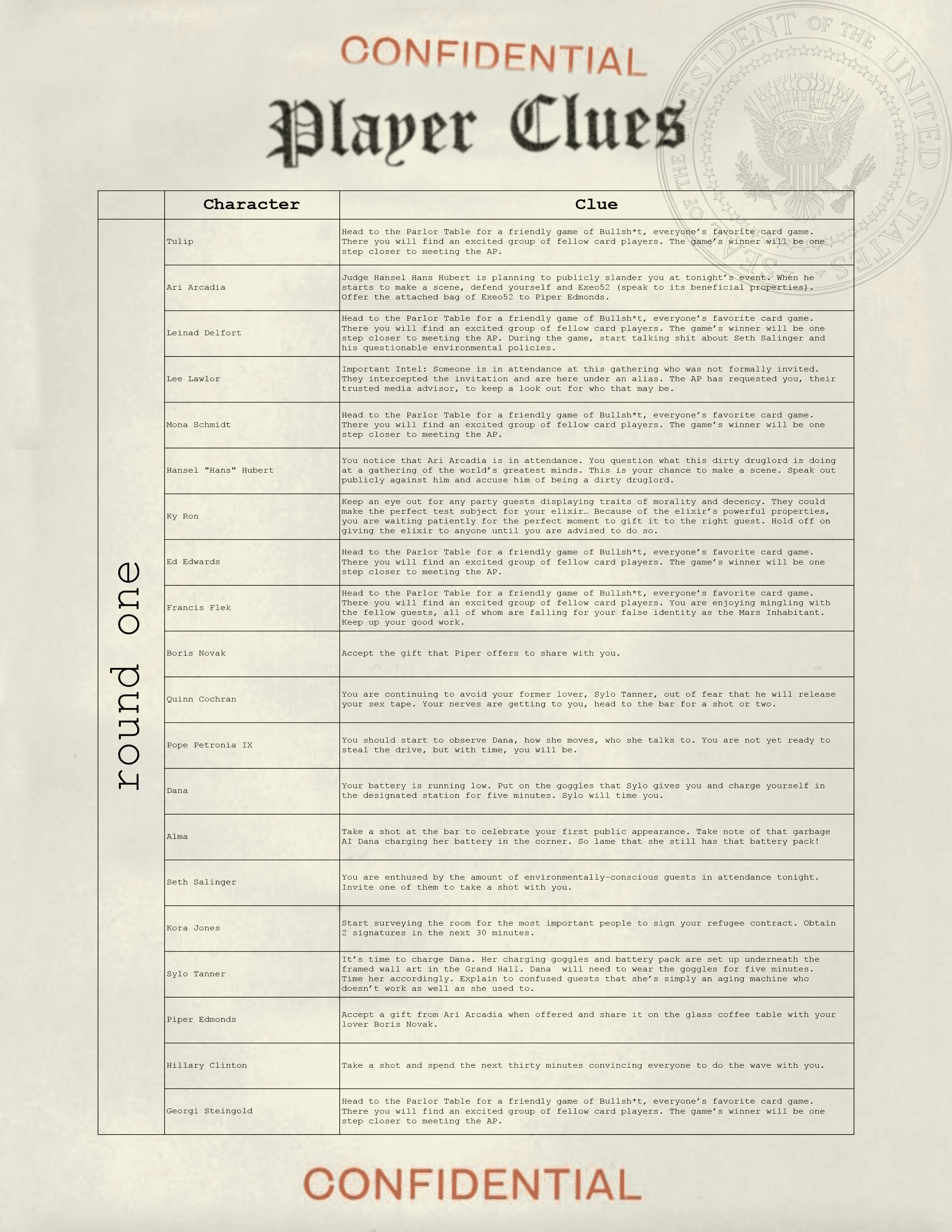 Remember - all documents are editable. You are free to make alterations to character names/bios, player clues, the invitations, etc. 2084: The Anonymous President works best if you and your group feel comfortable and confident embracing the world that we have created for you.